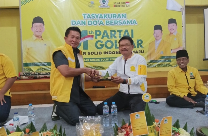 Acara tasyakuran digelar secara sederhana dengan berdoa dan ditandai pemotongan tumpeng oleh ketua DPD Golkar Gresik, Wongso Negoro, yang diberikan kepada sesepuh Golkar yang juga ketua Fraksi Golkar DPRD Gresik, Atek Ridwan.