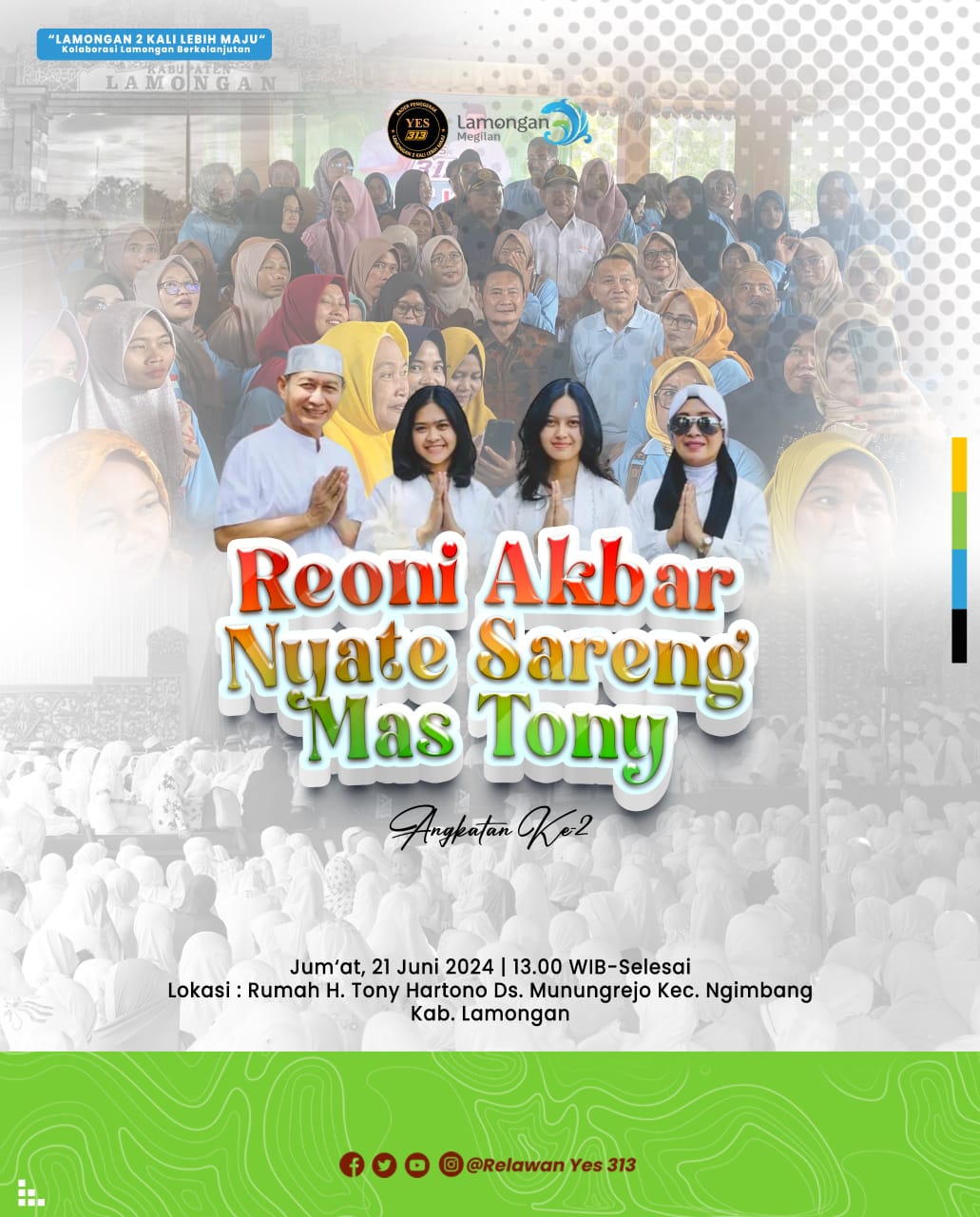 Lamongan, Krindotv.com – Reuni akbar “Kader Penggerak YES 313” yang digelar di kediaman H. Tony Hartono, Desa Munungrejo, Kecamatan Ngimbang – Lamongan, berlangsung cukup meriah, dengan dihadiri kurang lebih 400 kader. Jum’at (21/06/2024).