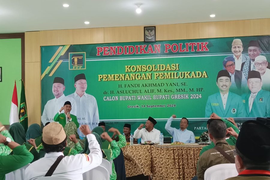 Gresik // krindo.tv.com – Dewan Pimpinan Cabang Partai Persatuan Pembangunan (DPC PPP) Kabupaten Gresik menggelar konsolidasi pemenangan Pemilukada bersama Pasangan calon Bupati dan wakil bupati Gresik 2024, H. Fandi Akhmad Yani, SE dan dr. H. Asluchul Alif, M.Kes, MM, M.Hp, (Yani-Alif) Sabtu (14/9) di kantor DPC PPP Jl. KH. Syafii Gresik.