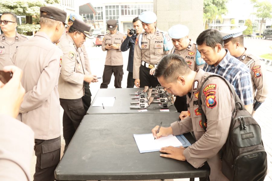 Puluhan senpi diperiksa secara menyeluruh, mulai dari kelengkapan surat-suratnya hingga kondisi fisik senpi itu sendiri. Pemeriksaan ini bertujuan untuk memastikan bahwa senpi yang dipegang oleh para petugas dalam keadaan baik, aman, dan terawat, serta digunakan sesuai dengan prosedur yang berlaku.