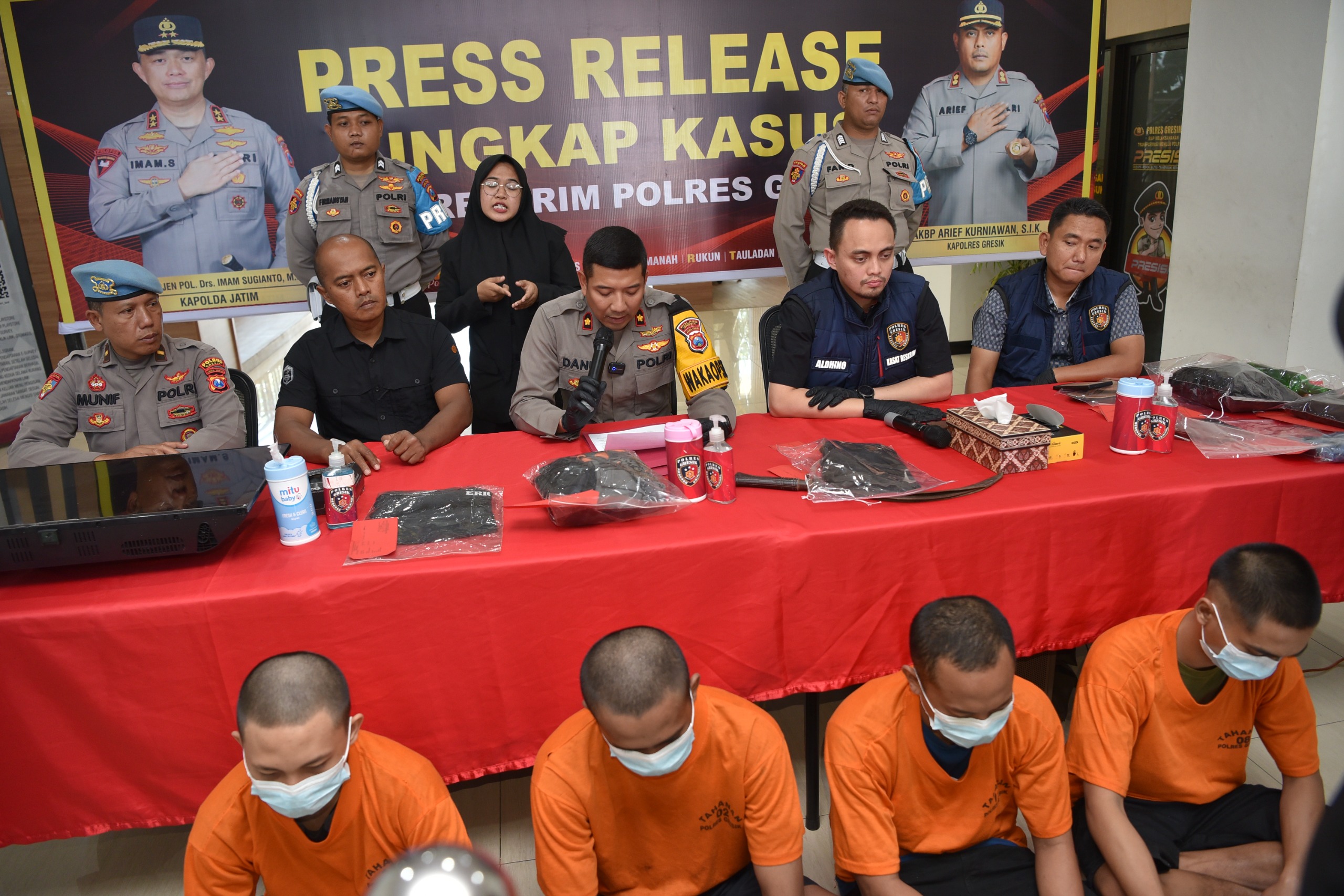 Wakapolres Gresik Kompol Danu Anindhito Kuncoro Putro didampingi Kasat Reskrim Polres Gresik AKP Aldhino Prima Wirdhan, Kanit Pidum Sat Reskrim Polres Gresik Iptu Eriq Panca, Kasi Humas Polres Gresik Iptu Wiwit menggelar press release ungkap kasus Pengeroyokan, Pengeroyokan Korban Meninggal Dunia, Pencurian dan Curanmor.