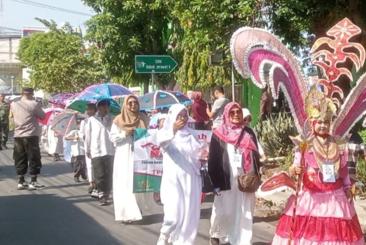 Santriwan/ti Thoriqul Jannah terlihat sangat antusias ditengah terik matahari pagi di lapangan olahraga Babat Jerawat kecamatan Pakal Kota Surabaya berjalan sambil memakai payung yang dihias.