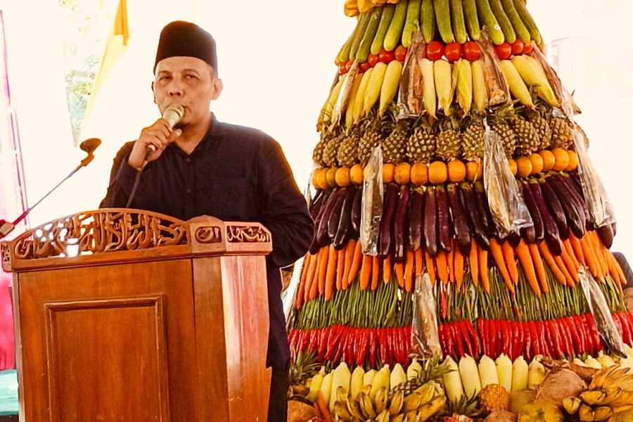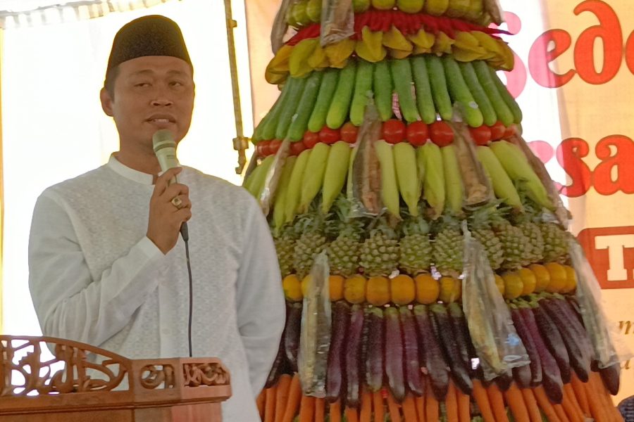 Pemberian santunan anak yatim secara simbolis kemudian Bupati memilih hasil bumi yang ada di tumpeng raksasa untuk diberikan warga yang sudah siap menghadang.