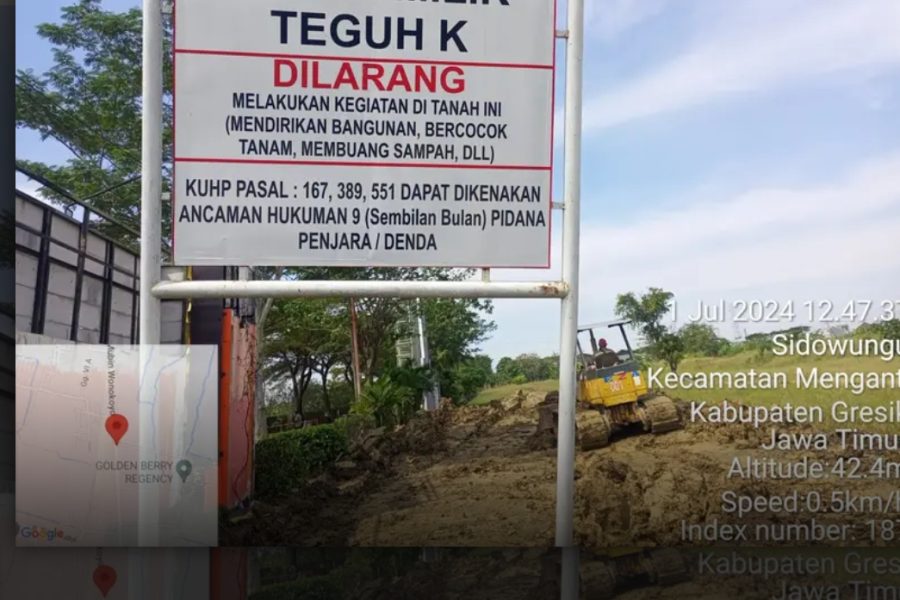 hal ini bahwa, pengurukan tanah yang di lakukan pelaksana saudara Yogi tidak mempunyai izin . dan melanggar peraturan Bupati Gresik nomer 96 tentang kemanfaatan tanah urukan . pasal 5 Setiap orang atau badan yang melakukan pemanfaatan